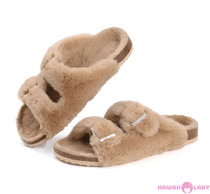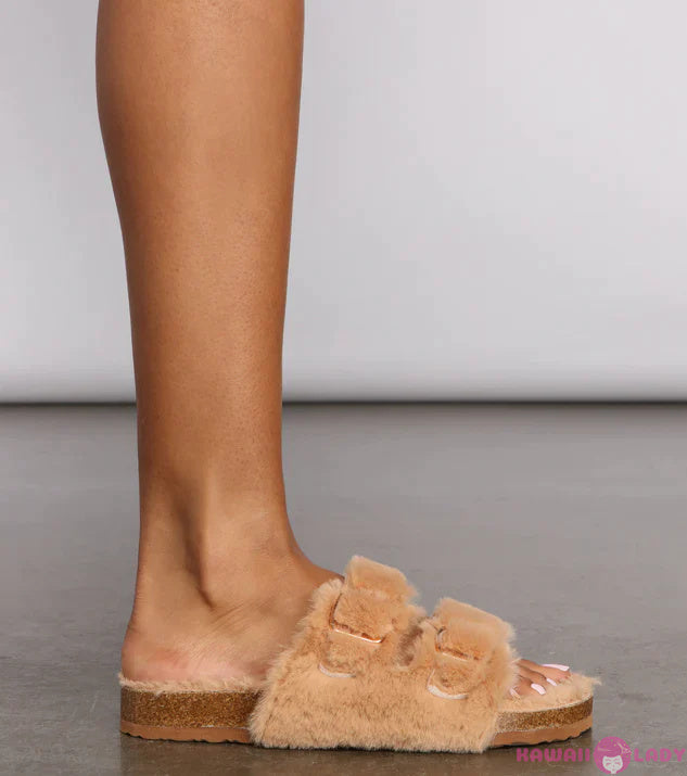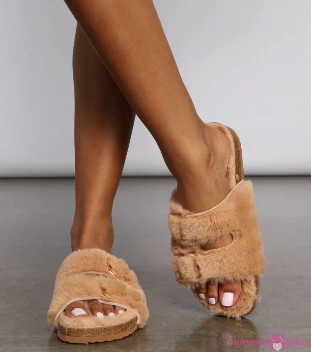 Our Fuzzy Clogs offer not one, but two layers of appeal. Featuring an easy-slip on design and a unique double row strap design with gold buckles, they exude an air of sophistication that's perfect for fashion-forward individuals.