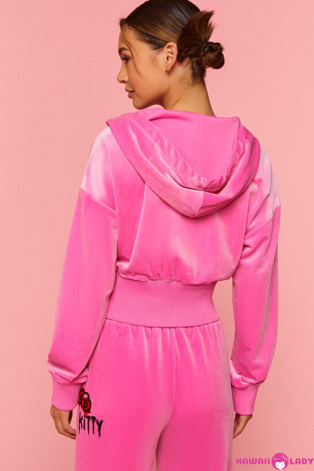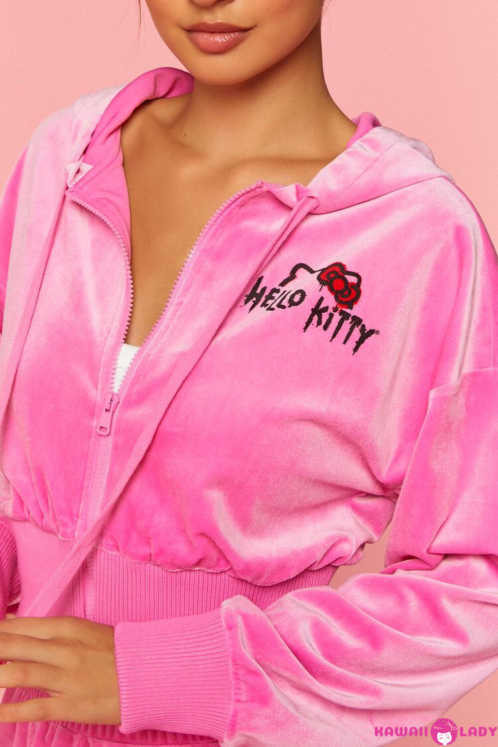 This Kawaii Lady Zip-up Hoodie features front "Hello Kitty" text and matching character graphic, long sleeves, a drawstring hood, and ribbed trim.