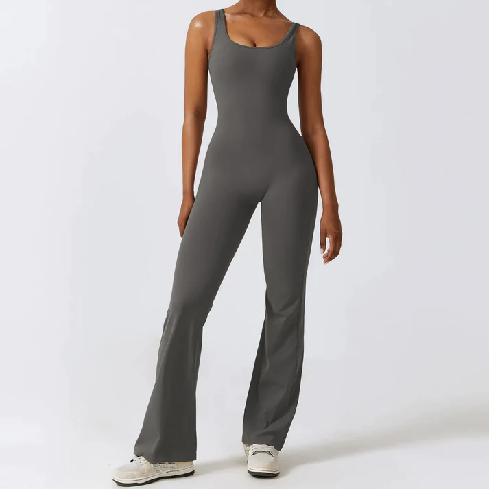 [Sexy Backless Flared romper] One-piece romper with removable breast pad, backless, round neck, slim-fit sleeveless vest top, V-shaped back, slightly pulled in, sleeveless vest romper, Hip Lift Yoga romper, full-length flared romper.